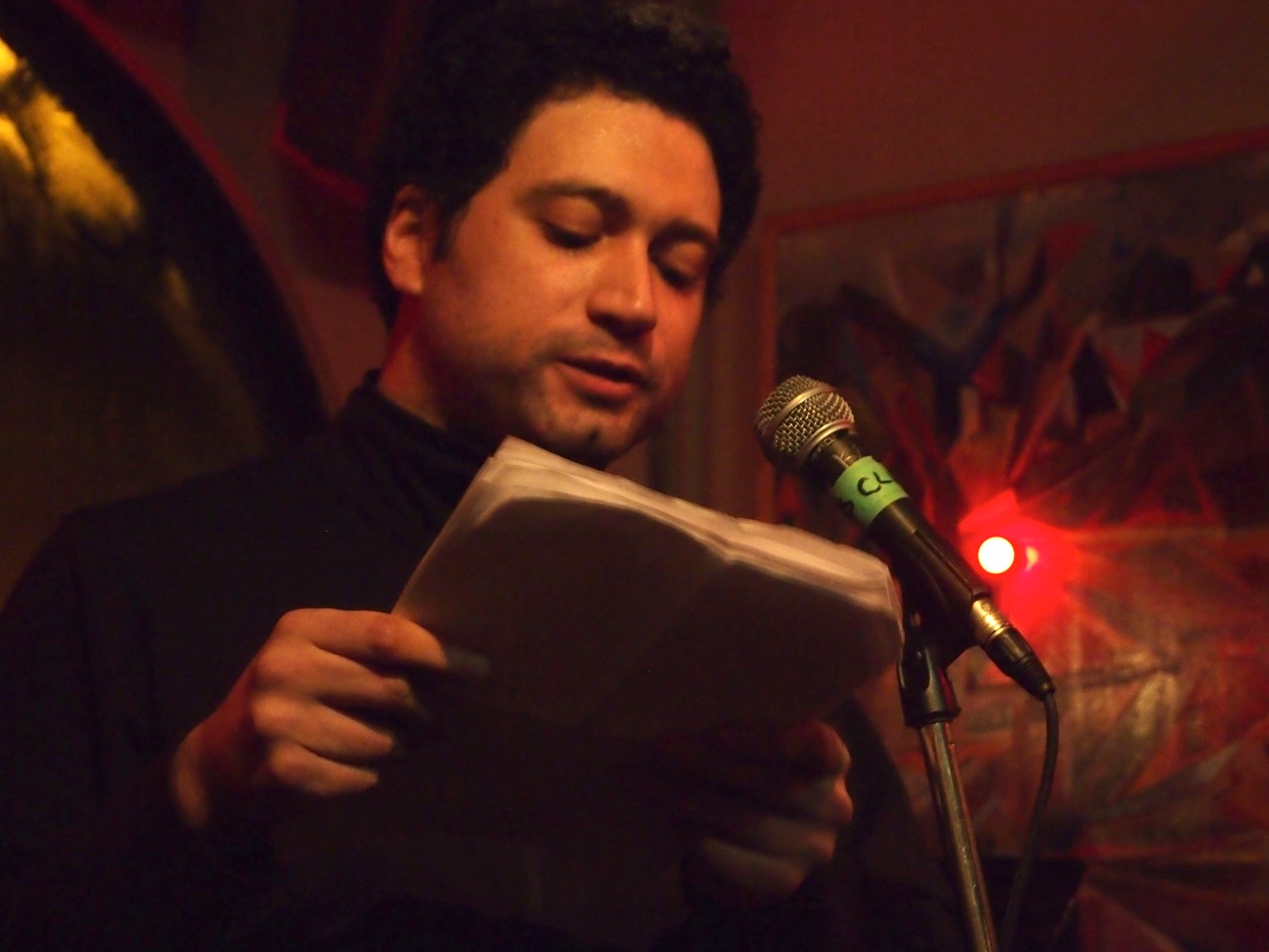 Marc di Saverio (photo by Phoebe Wang)The final reader of the night was Marc di Saverio who read from his debut collection Sanatorium Songs, published by Palimpsest Press. Not only did he read, di Saverio performed with an intense stage presence uncommon among poets just published for the first time. His writing is very acoustic and he has a talent for putting words into sonic combinations that are very creative and dynamic. Many writing instructors will tell you to avoid alliteration and assonance so as not to date your work, but di Saverio’s penchant for writing with his ears as well as his imagination is a unique talent. He reminds me of a modern-day Ginsberg. His poems are also very long but they maintain momentum and have enough variation to keep them interesting. Even when he uses a refrain, as in “Code Yellow,” di Saverio re-arranges the words in “my shard-studded club feet blaze me astray” many times to capture the audience’s interest. Whether or not you know what that line “means” its rhythmic quality is so catchy that it can linger in your memory for hours. His use of rhyme, assonance, alliteration, and repetition can be compared to a kind of poetical weaving. The words build on themselves, become taut, tense, interlocked, and full to bursting.