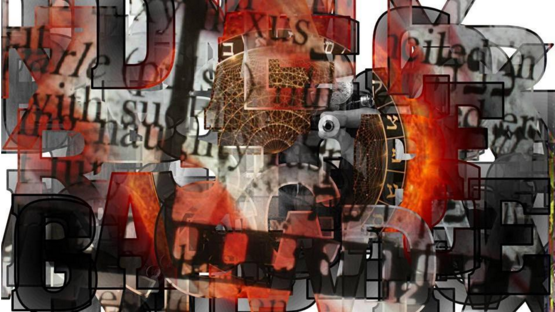 And in the spirit of inter-subjective collaboration, this asemic compilation has as its base slides composed from the lingual alchemy of self-proclaimed Luddite, and Toronto photographer, Blaine Speigel, created from the text of This Poem as well as Dyssemia Sleaze’s homophonic translations of The Book of Letters (which tracks how the world was created through language). These slides, composed of layers of text on acetate, were hand-placed on filmstrips then buried in the ground, treated with urine and semen and soil and then photographed and reframed. Then they were run through Jim Andrews’ dbCinemation, re-palimpsested and re-processed with a variety of shading techniques: