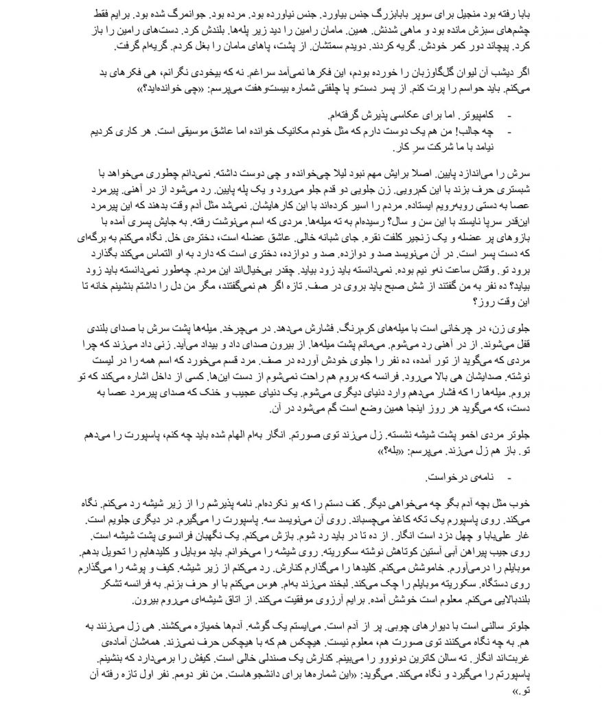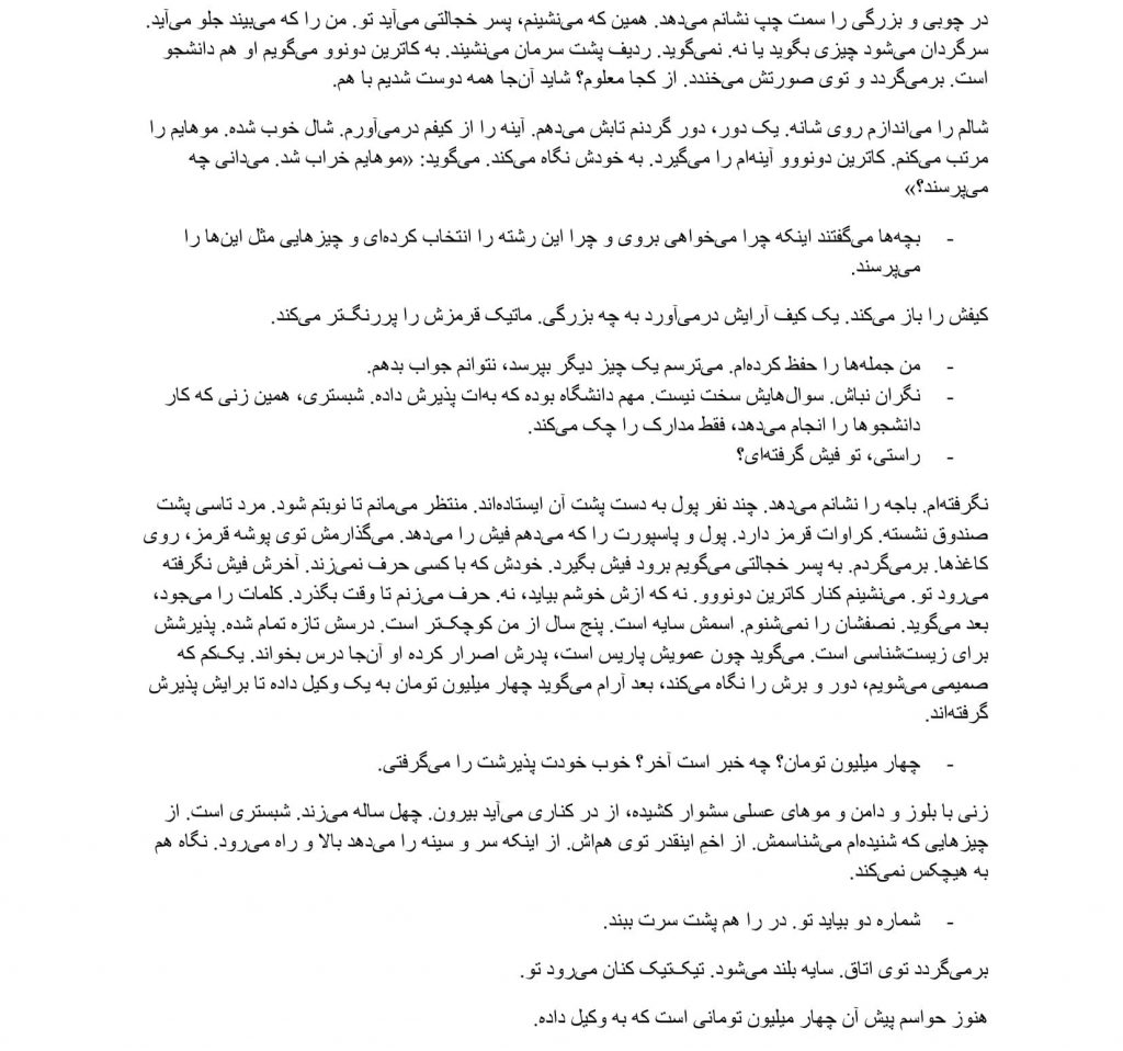 I haven’t. She shows me the kiosk. A few people stand in front of it money in hand. I wait for my turn. A bald man sits at the register. He wears a red tie. When I give him my money and passport he hands me a receipt. I put it in my red folder, over my papers. I walk back. I tell the shy guy to go get a receipt. He doesn’t speak with anyone. In the end, he goes in without having gotten the receipt. I sit next to Catherine Deneuve. Not that I like her, no. I talk with her to pass the time. She chews her words before speaking them. I hear only half of them. Her name is Sayeh. She is five years younger than me. She has just finished her studies. She has now received an admission for a master’s in biology. She says her father insisted that she go to Paris to study because that’s where her uncle lives. When we get to know each other a bit more, she looks around, then quietly confesses that she has paid four million tomans to a lawyer to apply and get her the admission.
