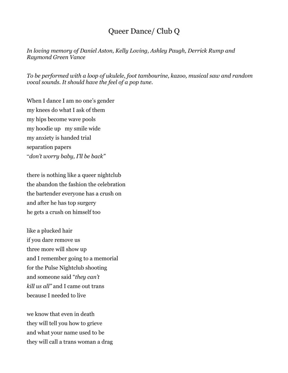 I wrote this one after the mass shooting at Club Q happened in Colorado Springs in 2022. This happened during the lockdowns and it was especially isolating to experience this grief. When I perform it in public, it’s like a little cure for that memory. I chose to make the music pretty fun and novel, because that’s the feeling I get in queer dance spaces. Before the last queer was saved, mainstream news was already getting the narrative wrong, the pronouns, the heroes. I wanted to get it right and honour their stories.