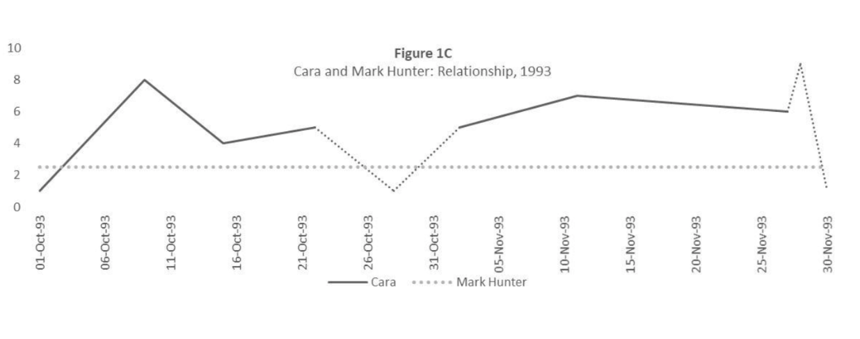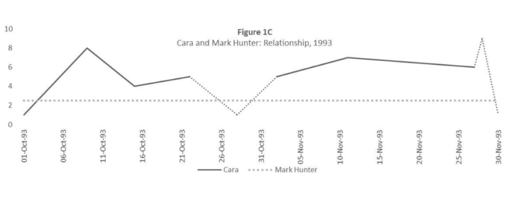 That Cara never reaches “the zero of forgetting” foregrounds the lingering impact of the relationship on Cara, reflecting both her emotional vulnerability and her unwillingness to let go of the past. Schneider contrasts the indisputability of the relationship’s impact on Cara with the ambiguity of Mark’s emotional investment in the relationship. It emphasizes Cara’s emotional vulnerability in the relationship and her inability to effectively shield herself from the pain of a one-sided relationship. It’s a pain that endures, even as successive graphs illustrate later relationships that veer from the neglectful to the awkward, and, finally, to the neat overlapping lines of marital happiness.